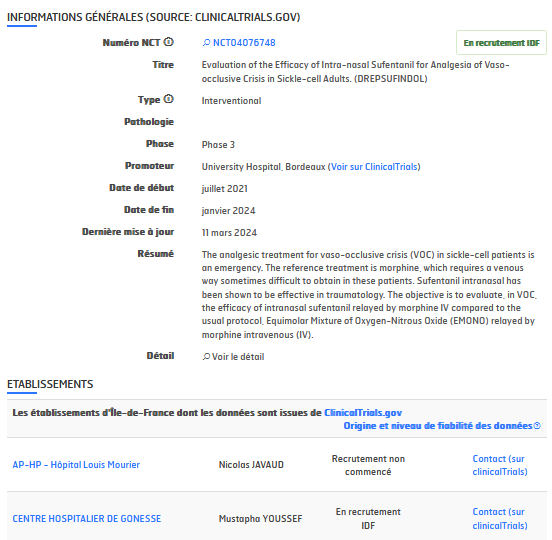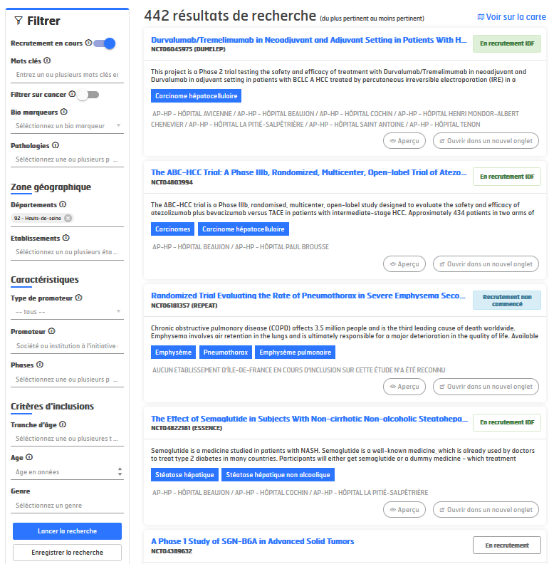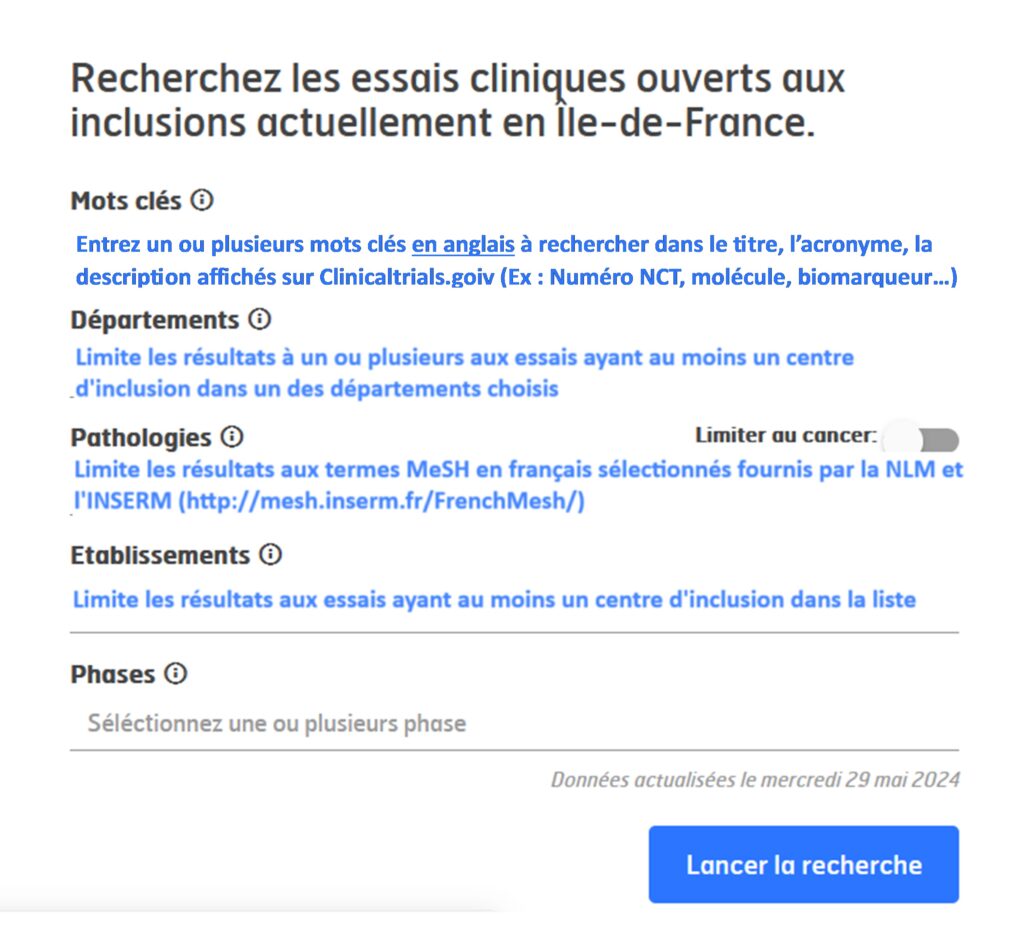 - Les données des essais cliniques référencés sur ClinicalTrials.gov et ayant au moins un centre d’inclusion en Île-de-France