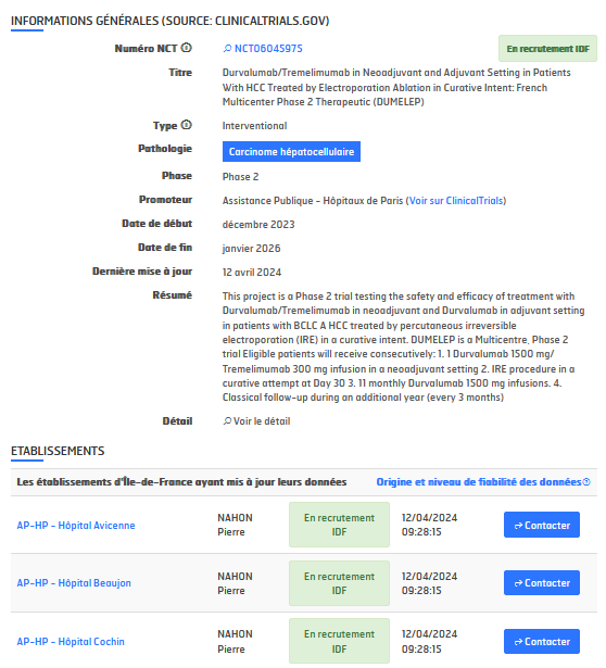 En l’absence de fiabilisation du stade d’avancement des essais dans les différents centres d’investigation par un envoi de données régulier sur Essais’Clic , l’information affichée est celle qui figure sur clinicaltrials.gov . Pour prendre contact avec le centre d’investigation vous pouvez cliquer sur le lien “Contact (sur clinicalTrails)” qui vous donnera accès aux informations saisies par le promoteur lors de l’enregistrement de l’essai sur clinicaltrials.gov.